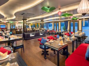 Enjoy delicious local food prepared and served for you by our wonderful onboard catering staff, night view on Lan Ha Bay is incredible.